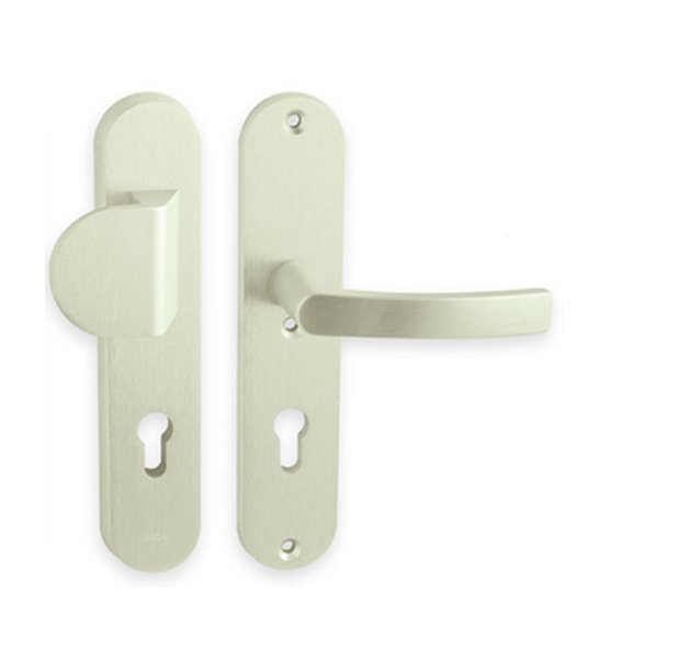 Štítová kľučka na vchodové a bezpečnostné dvere s bezpečnostným oválnym štítom bez prekrytia cylindrickej vložky je vyrobená z hliníka a je povrchovo upravená. Oválny štít má rozmery 52 mm x 242 mm a hrúbku 15 mm.