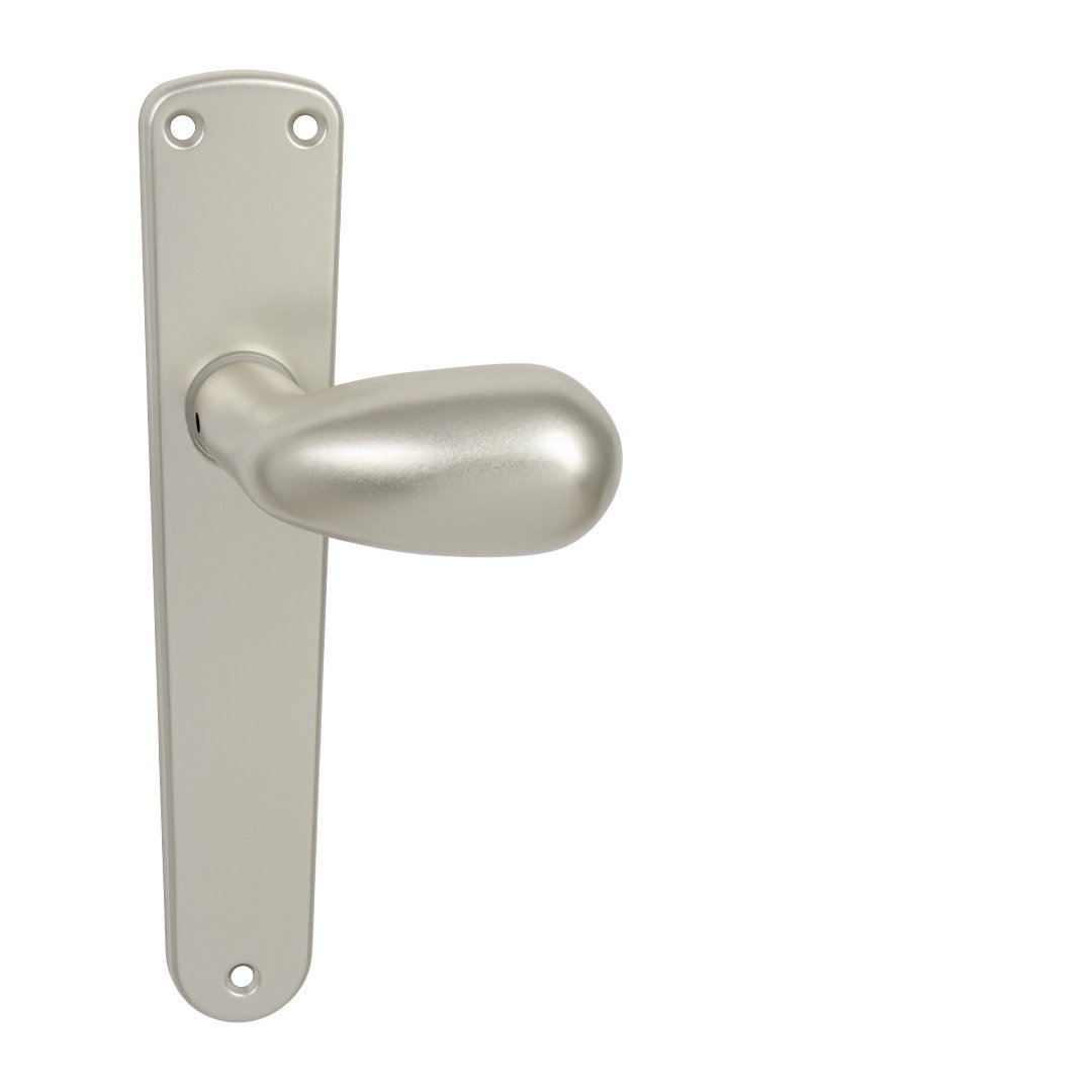 Štítová kľučka na interiérové dvere s oválnym štítom je vyrobená z hliníka a je povrchovo upravená. Kľučka neobsahuje vratný mechanizmus.