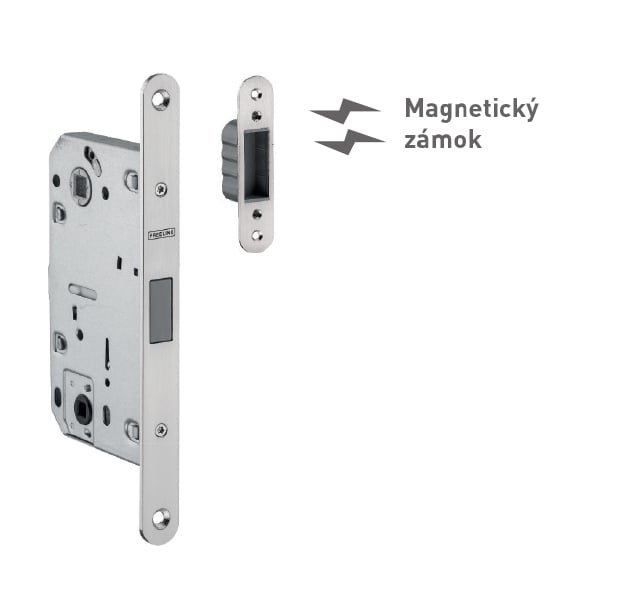 Magnetický zámok do dverí s otvorom pre WC kľúč s rozmermi čela zámku v dĺžke 196 mm, šírke 18 mm, hrúbke 3 mm. Rozteč (vzdialenosť medzi otvorom na kľučku a vložkou/kľúčom) – 85 mm , zádlab – 86 mm a dormas (vzdialenosť osi kľučky od lišty zámku) – 60 mm. So strednou záťažou použitia. Set obsahuje aj protiplech. Cena nezahŕňa cylindrickú vložku.