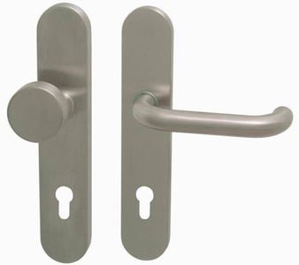 Štítová kľučka na vchodové a bezpečnostné dvere so spevneným oválnym štítom bez prekrytia cylindrickej vložky je vyrobená z vysokokvalitnej nehrdzavejúcej ocele, známej ako nerez a je povrchovo upravená.