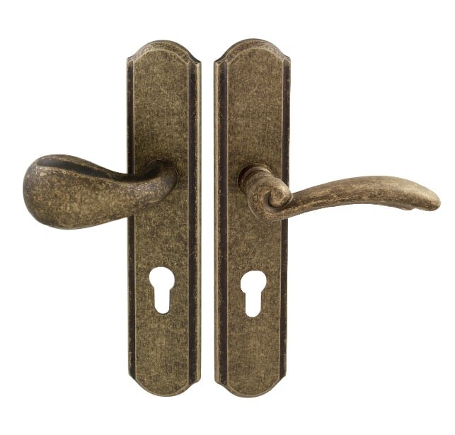 Štítová kľučka na vchodové a bezpečnostné dvere so spevneným rustikálnym štítom bez prekrytia cylindrickej vložky je vyrobená z materiálov vysokej kvality – mosadz a je povrchovo upravená. Rustikálny štít má rozmery 51 mm x 250 mm a hrúbku 12 mm.