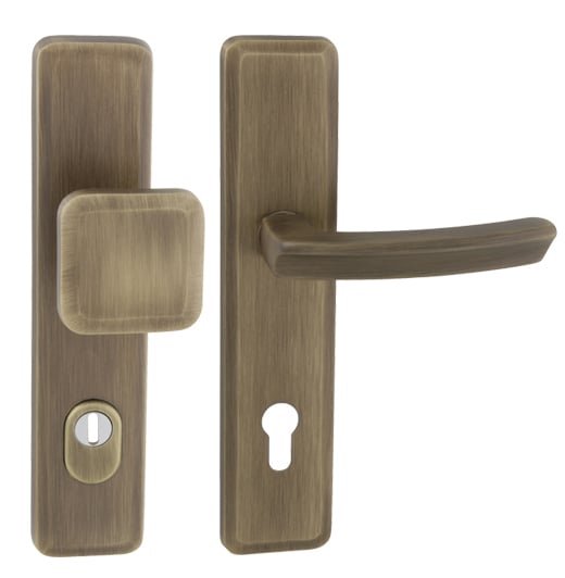 Štítová kľučka na vchodové a bezpečnostné dvere so spevneným hranatým štítom s prekrytím cylindrickej vložky je vyrobená z materiálov vysokej kvality – mosadz a je povrchovo upravená. Hranatý štít má rozmery 55 mm x 250 mm a hrúbku 12 mm.