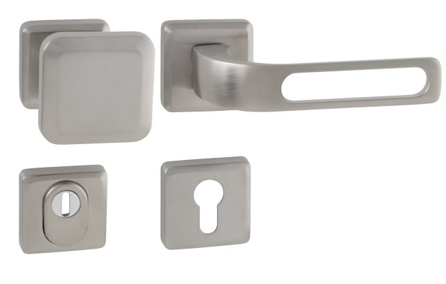 Rozetová kľučka na vchodové a bezpečnostné dvere so spevnenou hranatou rozetou s prekrytím cylindrickej vložky je vyrobená z materiálov vysokej kvality – mosadz a je povrchovo upravená. Hranatá rozeta má rozmery 53 mm x 53 mm a hrúbku 12 mm.