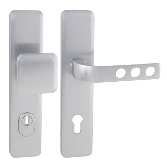 Štítová kľučka na vchodové a bezpečnostné dvere so spevneným hranatým štítom s prekrytím cylindrickej vložky je vyrobená z materiálov vysokej kvality – mosadz a je povrchovo upravená. Hranatý štít má rozmery 55 mm x 250 mm a hrúbku 12 mm.