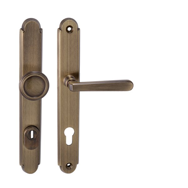 Štítová kľučka na vchodové a bezpečnostné dvere so spevneným rustikálnym štítom s prekrytím cylindrickej vložky je vyrobená z materiálov vysokej kvality – mosadz a je povrchovo upravená. Rustikálny štít má rozmery 38 mm x 280 mm a hrúbku 11 mm.