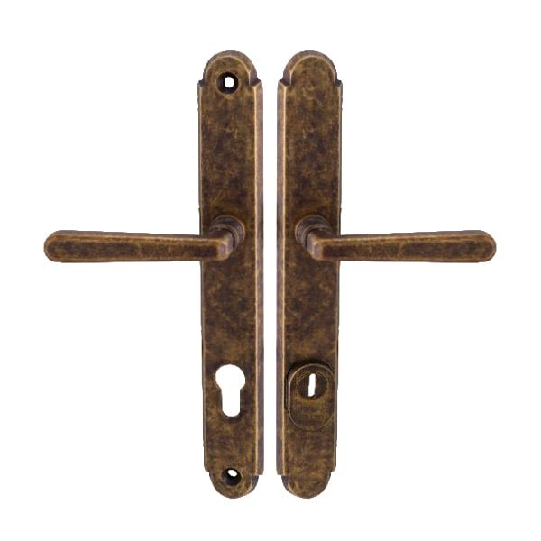 Štítová kľučka na vchodové a bezpečnostné dvere so spevneným rustikálnym štítom s prekrytím cylindrickej vložky je vyrobená z materiálov vysokej kvality – mosadz a je povrchovo upravená. Rustikálny štít má rozmery 38 mm x 280 mm a hrúbku 11 mm.