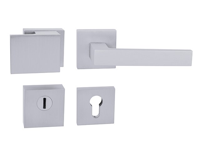Bezpečnostná interiérová rozetová kľučka na vchodové a bezpečnostné dvere s hranatou rozetou s prekrytím cylindrickej vložky je vyrobená z materiálov vysokej kvality – zamak/oceľ a je povrchovo upravená. Hranatá rozeta má rozmery 52 mm x 52 mm (resp. 55 mm x 52 mm) a hrúbku 17 mm.