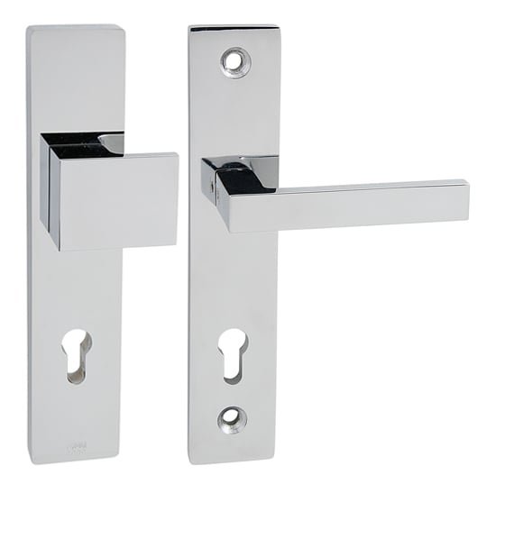 Štítová kľučka na vchodové a bezpečnostné dvere s bezpečnostným oválnym štítom bez prekrytia cylindrickej vložky je vyrobená z materiálov vysokej kvality – zamak a je povrchovo upravená. Oválny štít má rozmery 52 mm x 250 mm a hrúbku 17 mm.