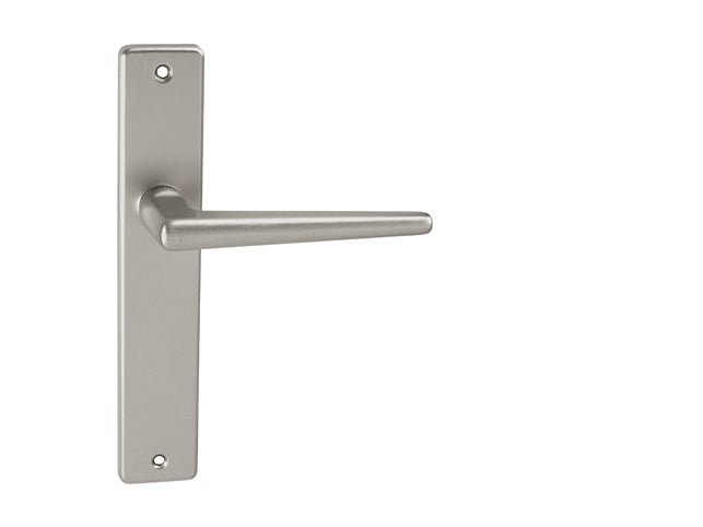 Štítová kľučka na interiérové dvere s dlhým hranatým štítom je vyrobená z hliníka a je povrchovo upravená. Dlhý hranatý štít má rozmery 40 mm x 220 mm a kľučka neobsahuje vratný mechanizmus.